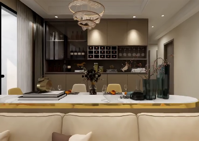 提升全景装饰感,除了优化客厅,设计师在平面布局上做了大胆创新,巧妙融入西方风格,以开放式西厨和西餐台作为空间的中心,使整个空间更加通透连贯,打造全新用餐环境体验。