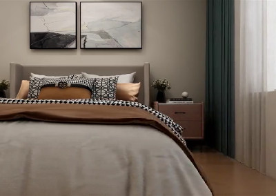 主卧选用了优雅大气的浅咖色作为主色调,颜色柔和温暖,局部采用灰色、雾霾蓝和金属色点缀,营造了一个沉静典雅的休憩空间,让居住者感到温馨和放松。床头背景墙的硬包设计,丰富空间层次的同时让卧室更有质感和格调。