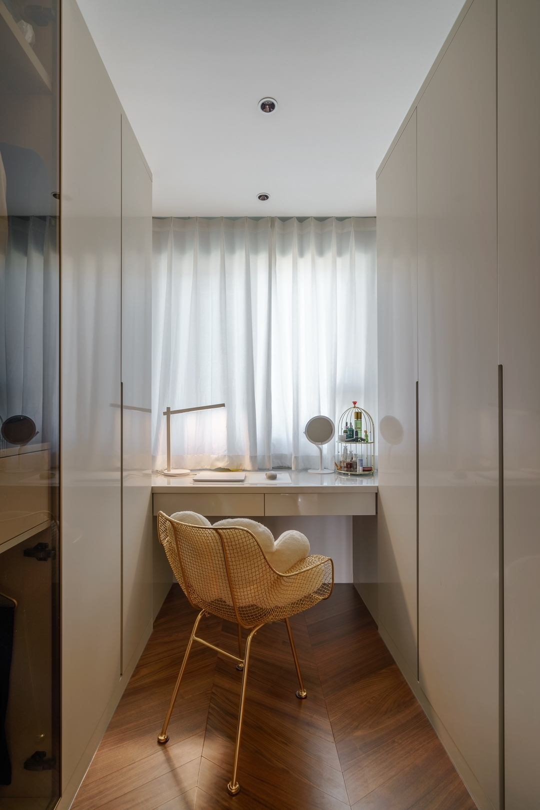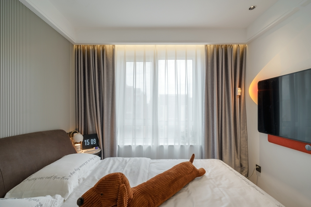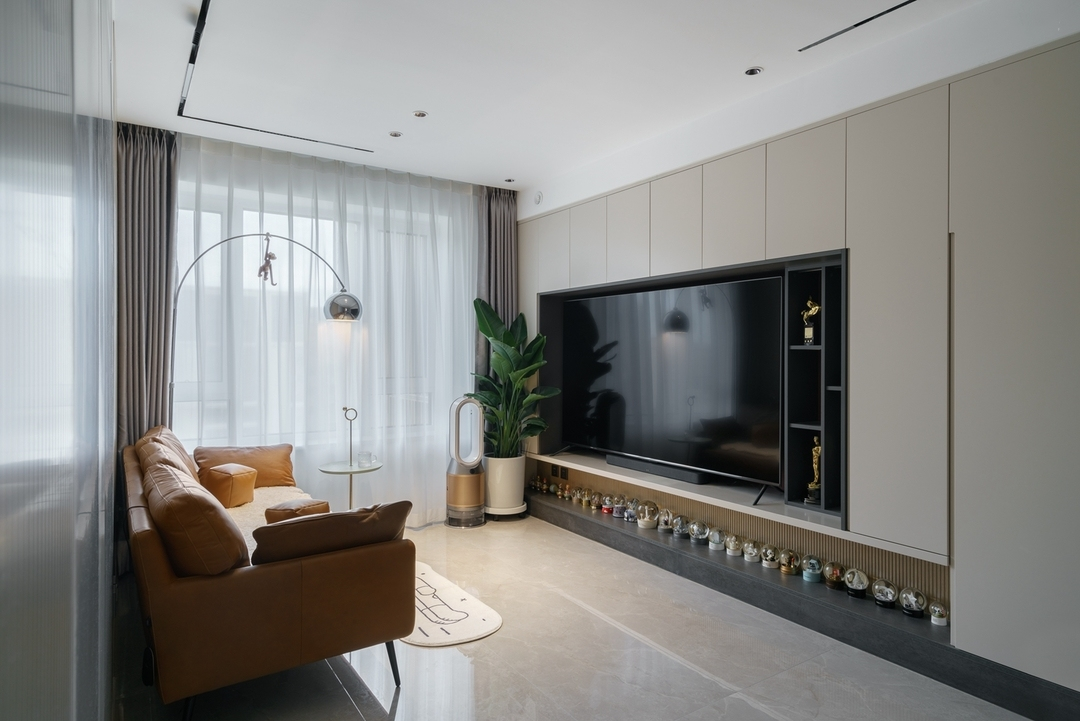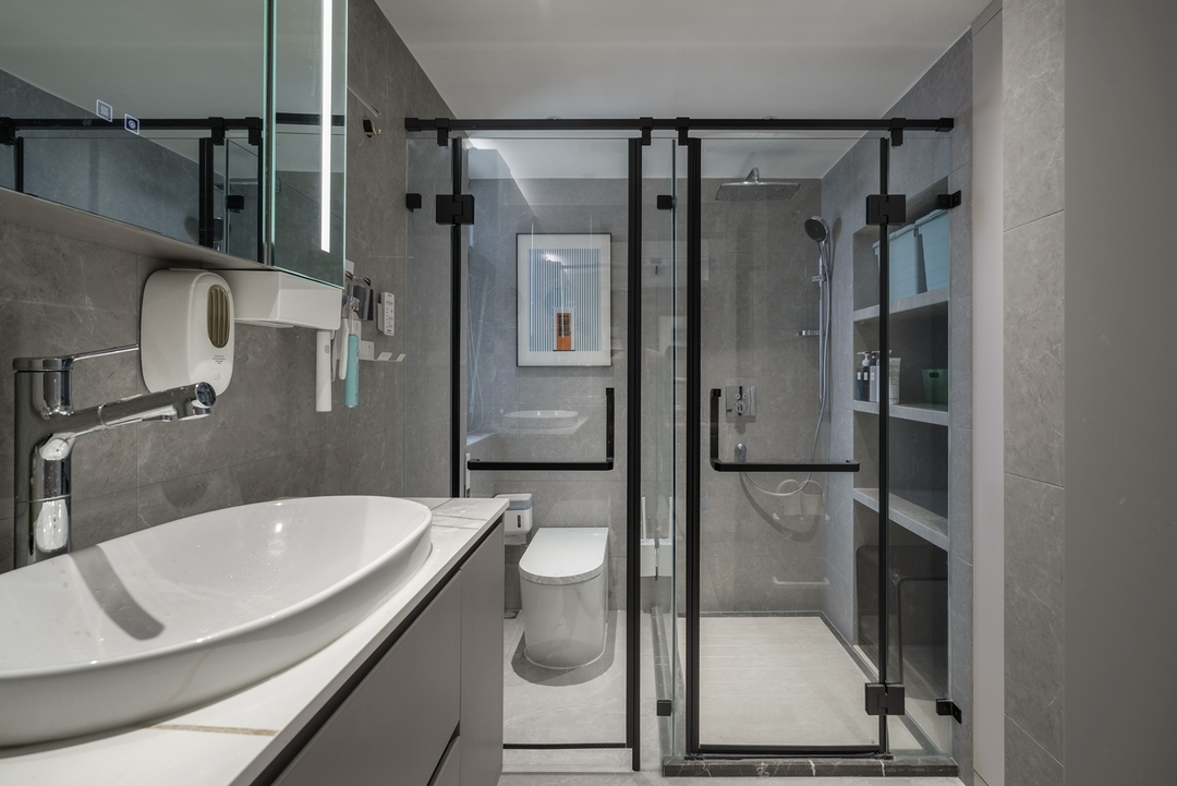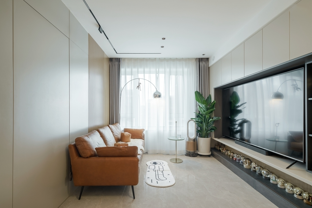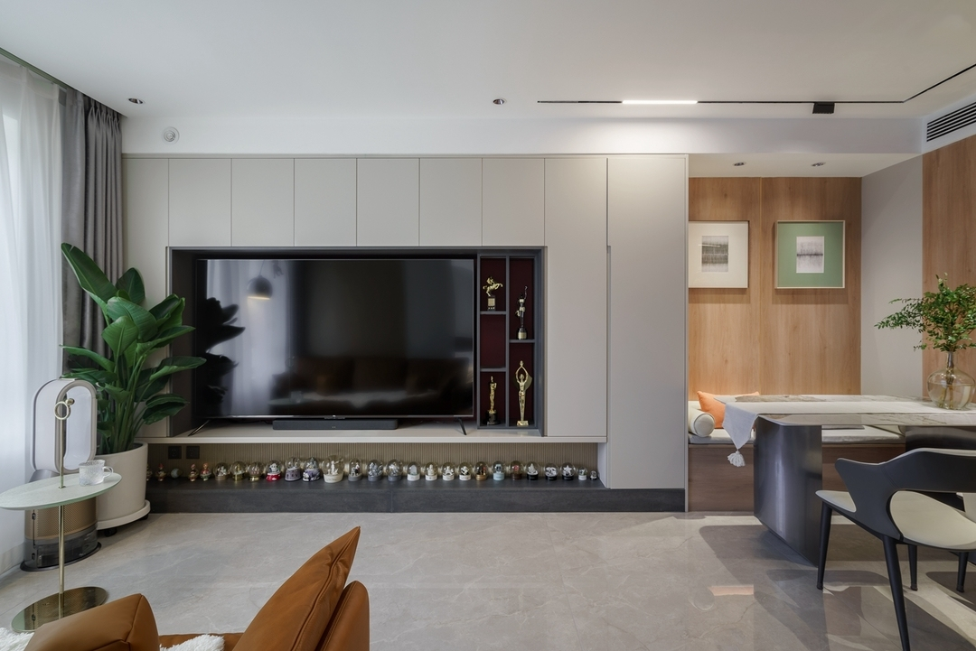 设计策略: 1、原始户型客餐厅面积紧张,在配色上以浅色为主,局部点缀亮色和深色。 2、全屋进行“隐形式”设计,将门弱化,达到放大空间的效果; 3、卫生间过小,无法满足日常使用需求,缩小主卧空间,扩大卫生间面积,实现三分离; 4、全屋做到顶储物柜,满足收纳需求;