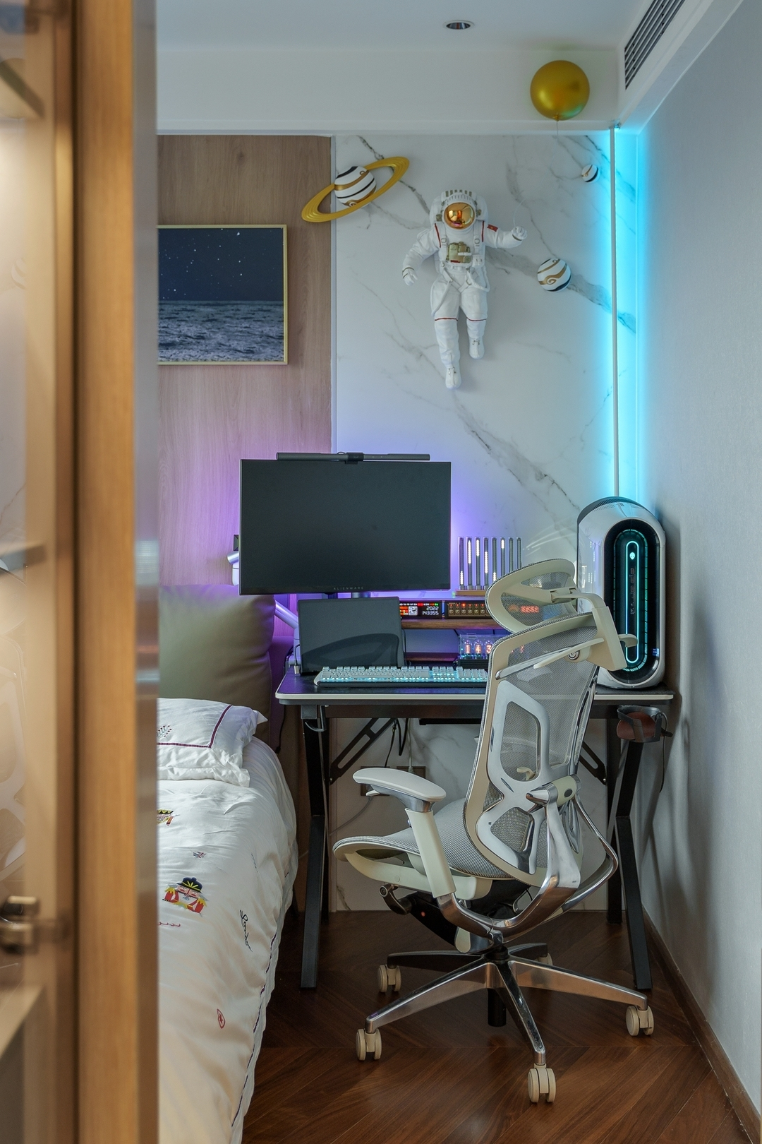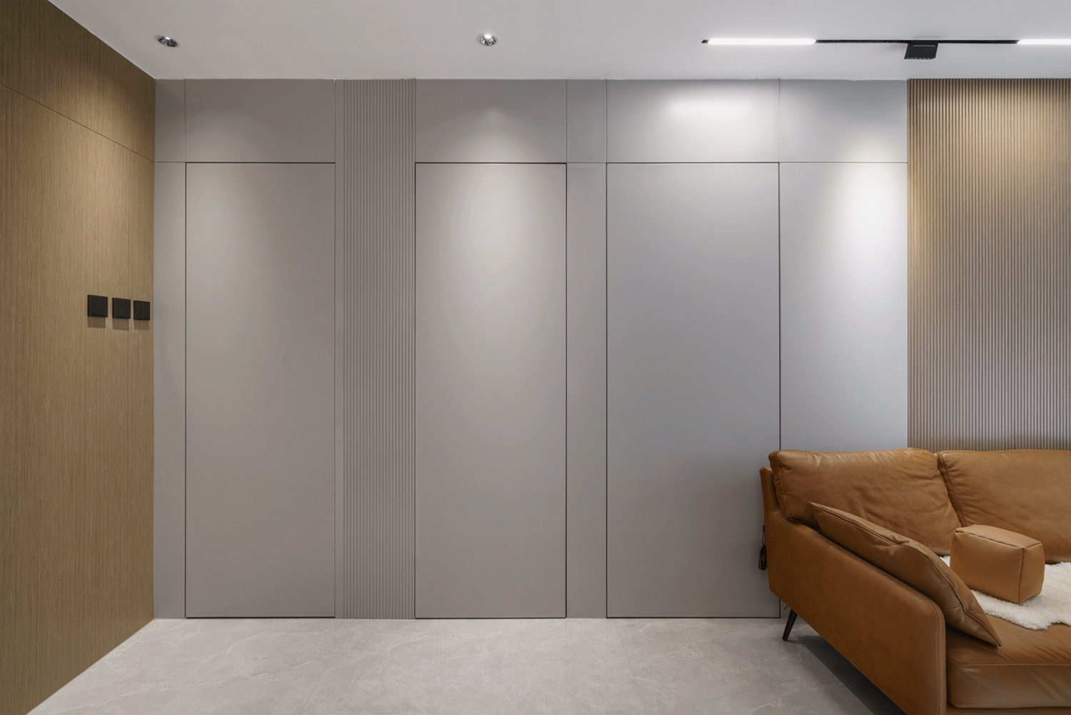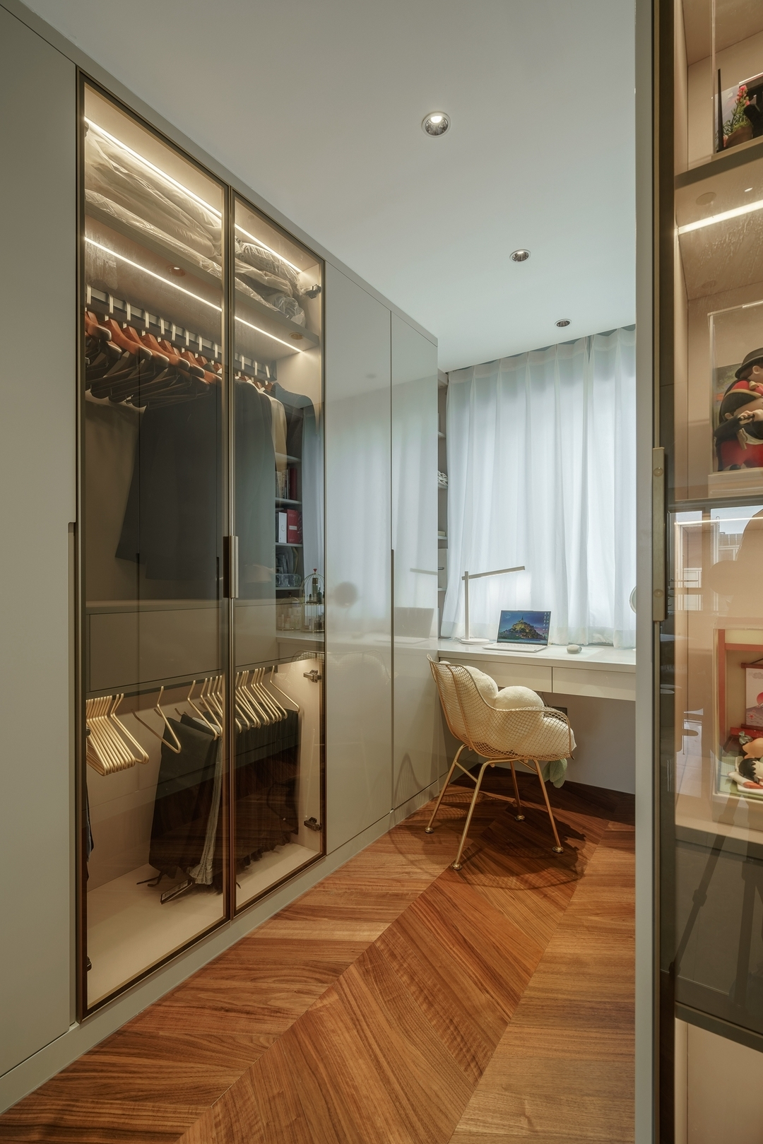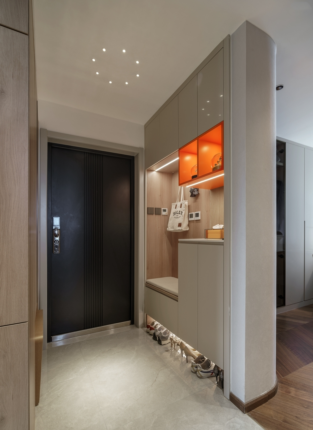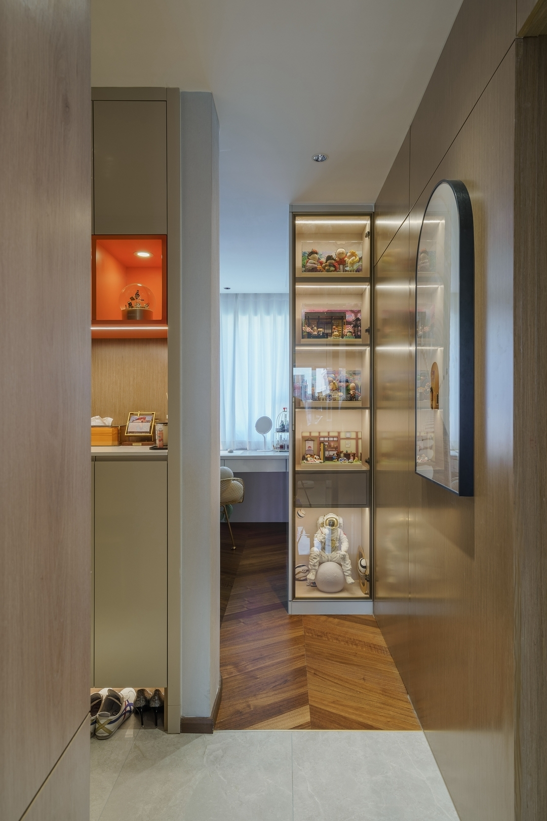 设计策略: 1、原始户型客餐厅面积紧张,在配色上以浅色为主,局部点缀亮色和深色。 2、全屋进行“隐形式”设计,将门弱化,达到放大空间的效果; 3、卫生间过小,无法满足日常使用需求,缩小主卧空间,扩大卫生间面积,实现三分离; 4、全屋做到顶储物柜,满足收纳需求;