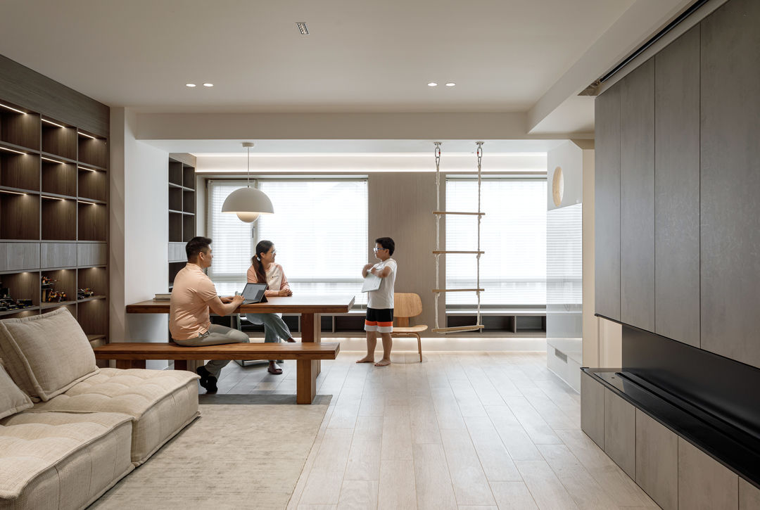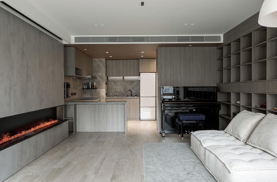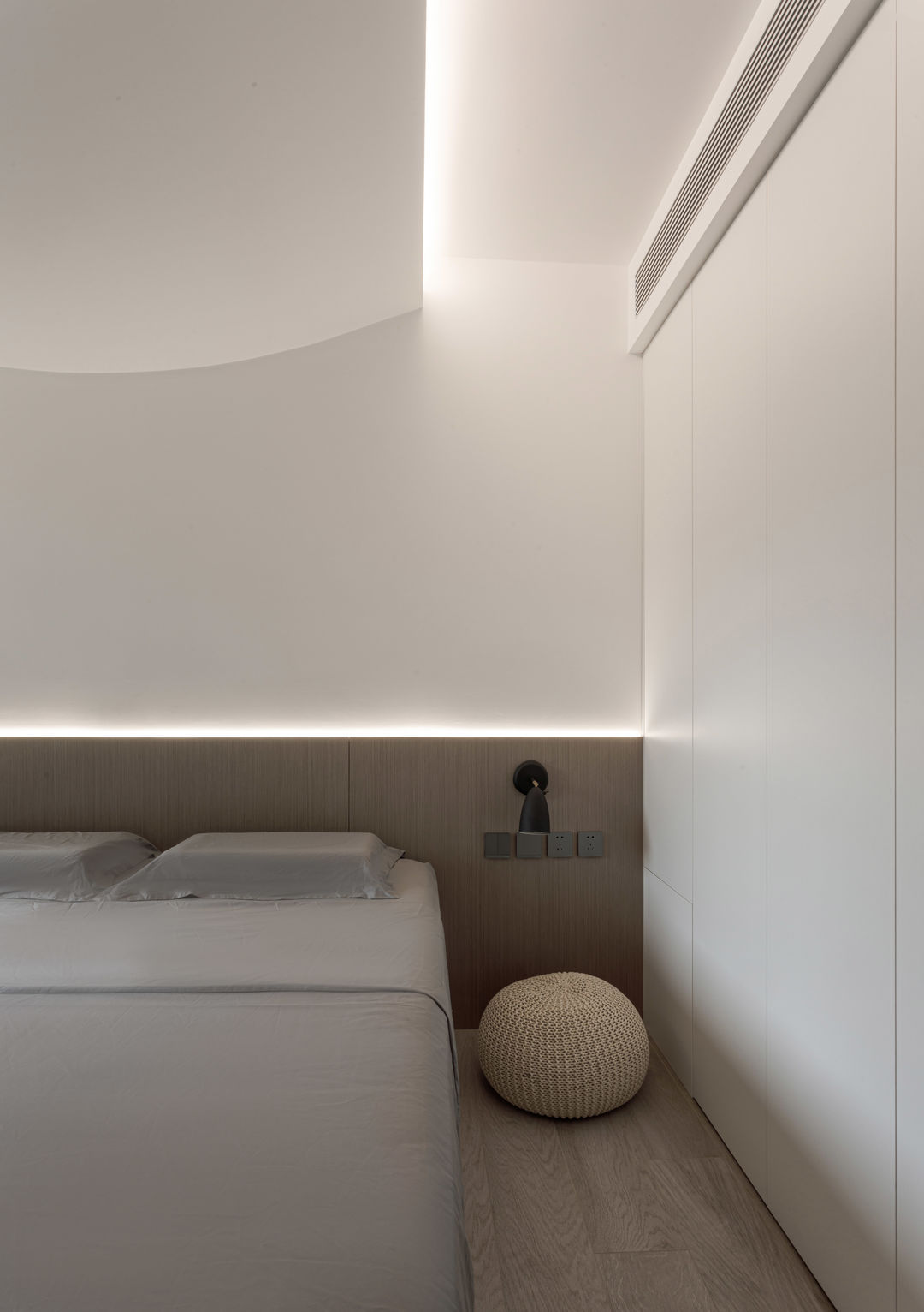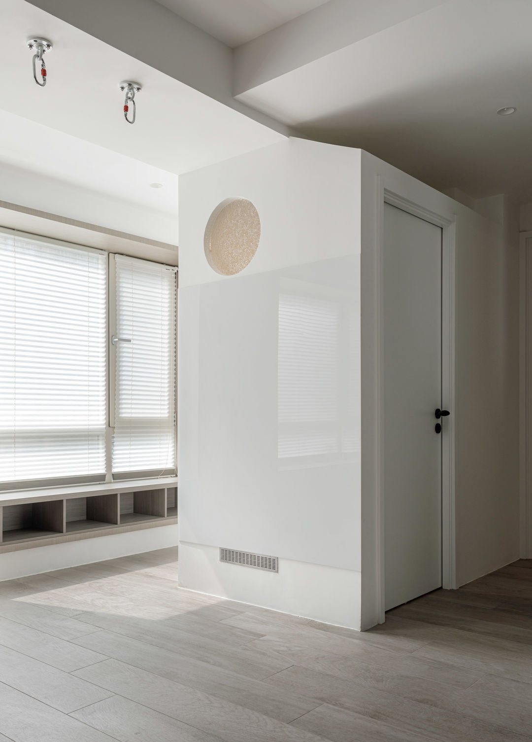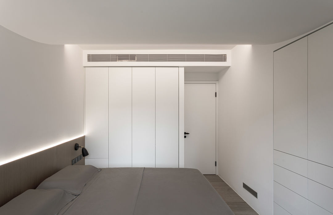 根据落地问题进行分析后,制定以下解决方案:绿色管道连接物业管道井内水冷空调,儿童房完全被巨梁隔断,进深无法安放室内机,通过与主卧空调共享风机解决制冷问题。红色管道代表新风,用地送风的形式避开主梁,主竖管连接的送风管道隐藏在儿童房收纳柜内。地新风,地暖管道,水电管道,主排污管道位移都同层铺设,避免任何交叉,解决层高问题。