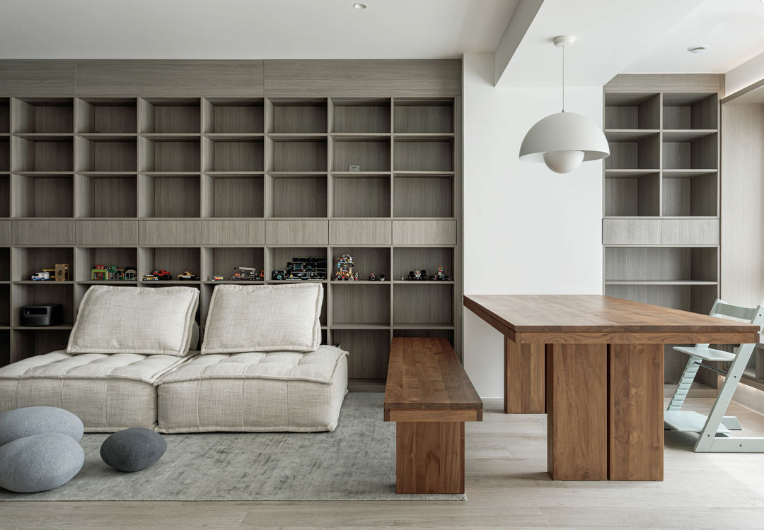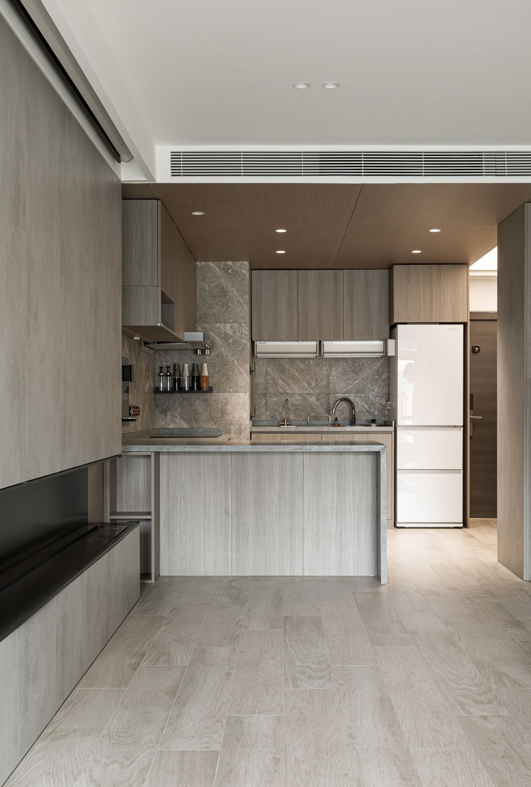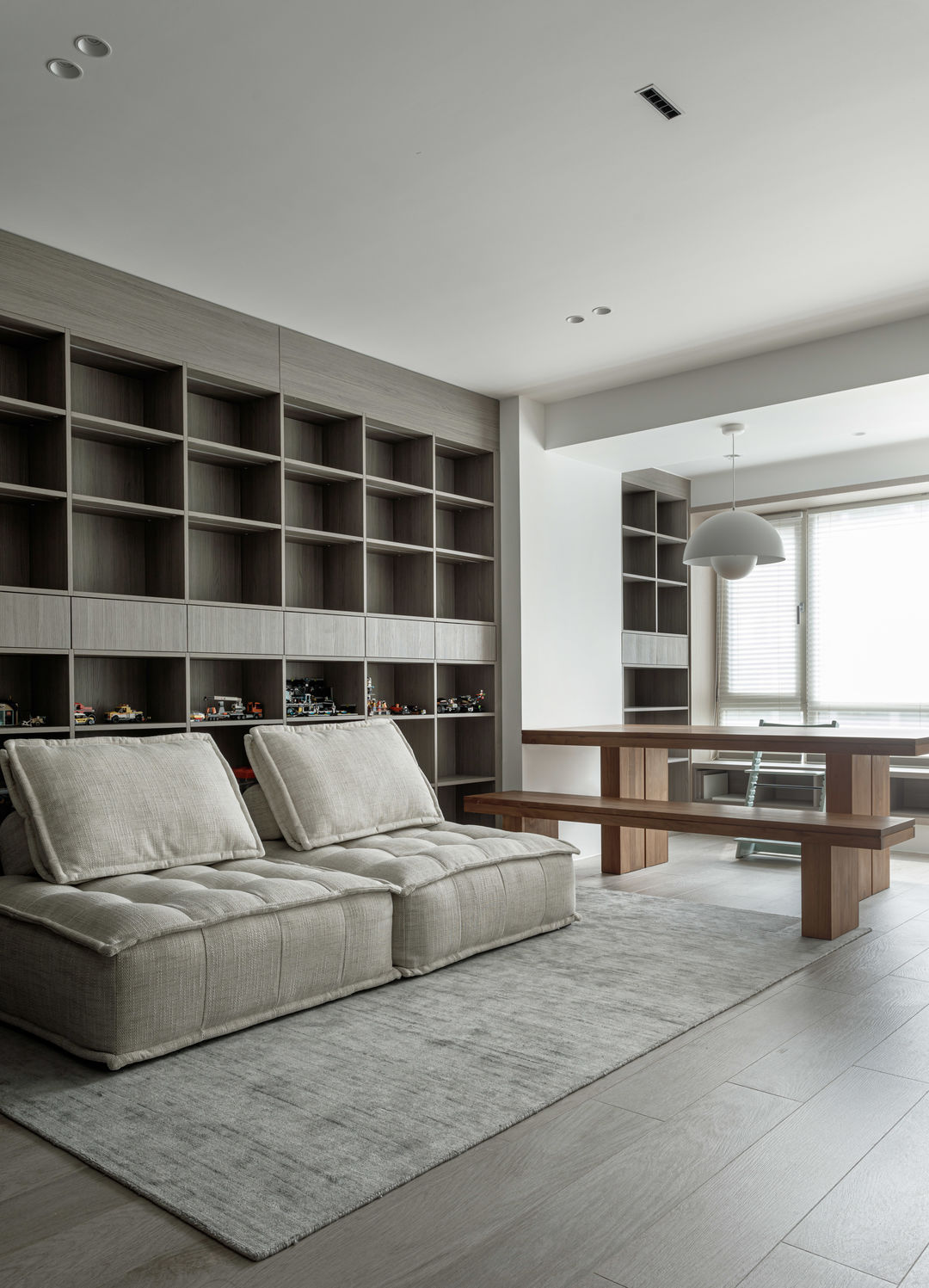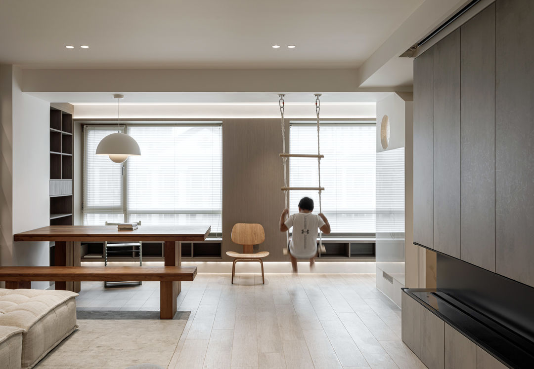 根据落地问题进行分析后,制定以下解决方案:绿色管道连接物业管道井内水冷空调,儿童房完全被巨梁隔断,进深无法安放室内机,通过与主卧空调共享风机解决制冷问题。红色管道代表新风,用地送风的形式避开主梁,主竖管连接的送风管道隐藏在儿童房收纳柜内。地新风,地暖管道,水电管道,主排污管道位移都同层铺设,避免任何交叉,解决层高问题。