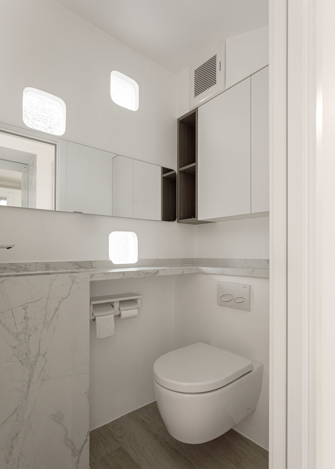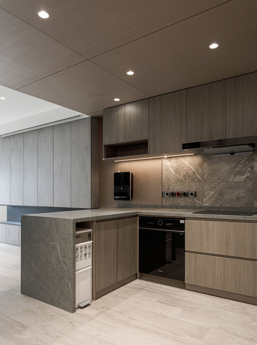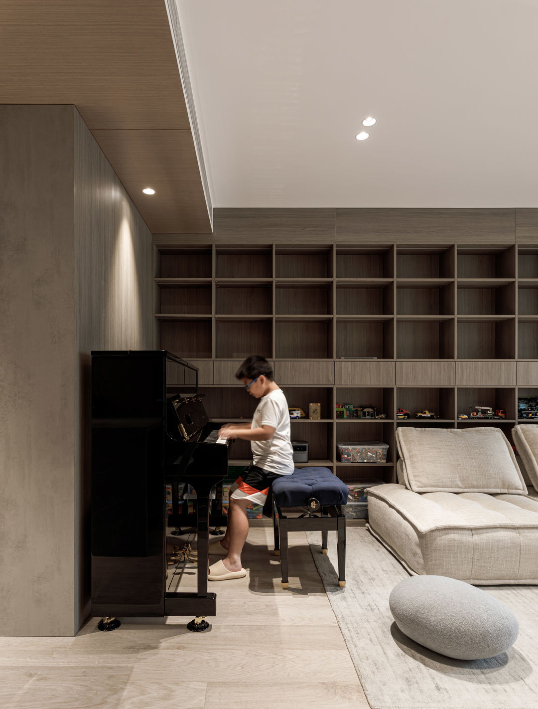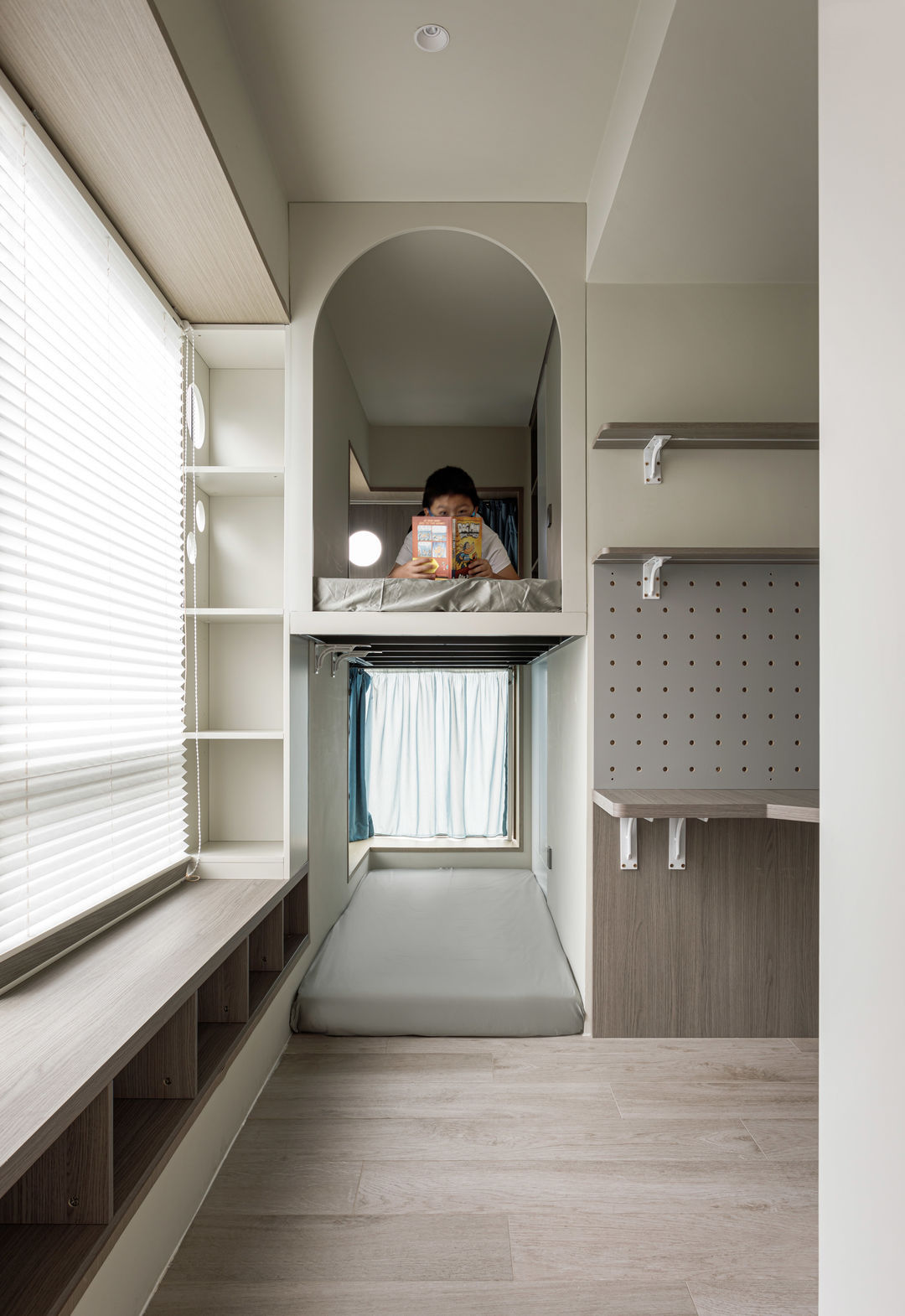 根据落地问题进行分析后,制定以下解决方案:绿色管道连接物业管道井内水冷空调,儿童房完全被巨梁隔断,进深无法安放室内机,通过与主卧空调共享风机解决制冷问题。红色管道代表新风,用地送风的形式避开主梁,主竖管连接的送风管道隐藏在儿童房收纳柜内。地新风,地暖管道,水电管道,主排污管道位移都同层铺设,避免任何交叉,解决层高问题。