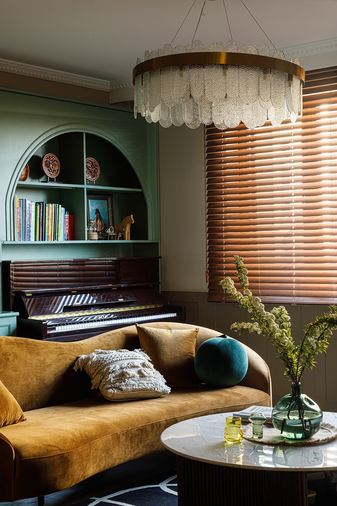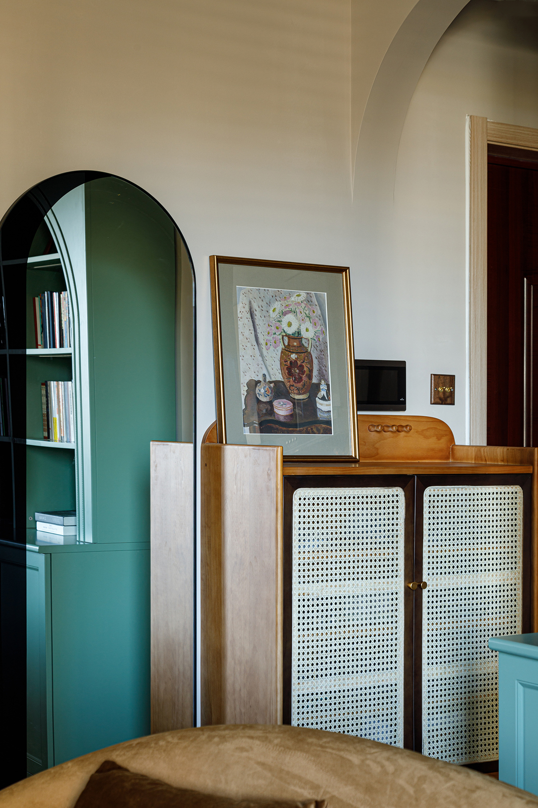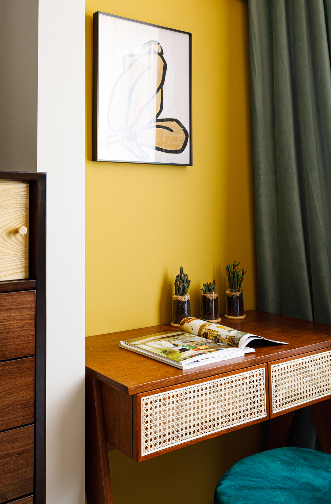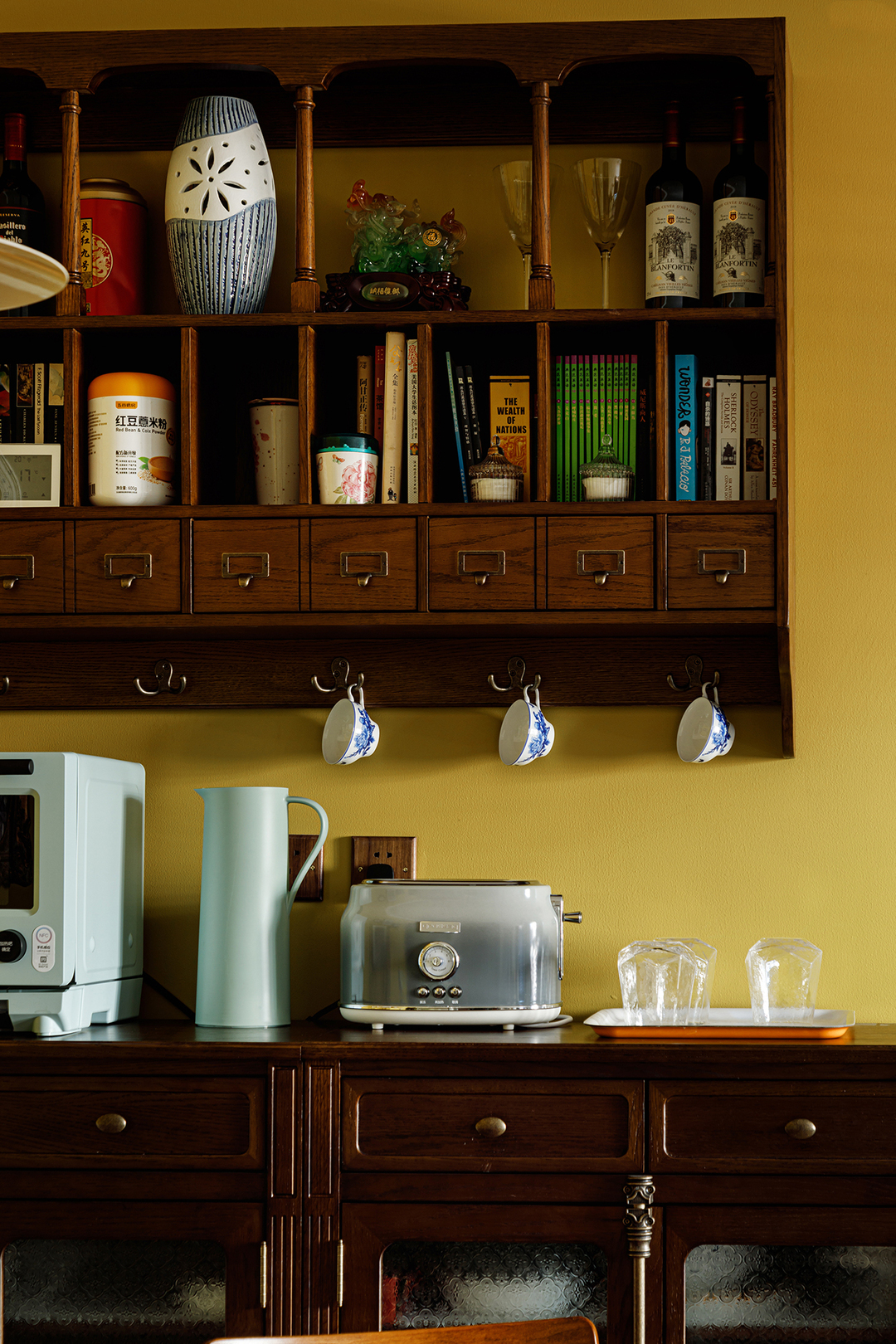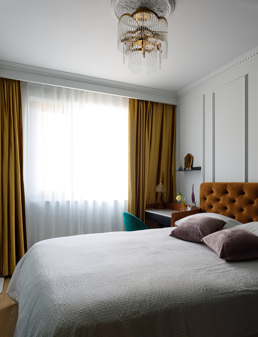 设计理念:采用了相对明显的撞色设计,大面积的蓝灰白色系搭配,恰到好处的红绿点缀,搭配墙面石膏线条、光线变化,堆叠出丰富的层次感,犹如思想者的稳重理性之美,渗透于每一个细微之处。