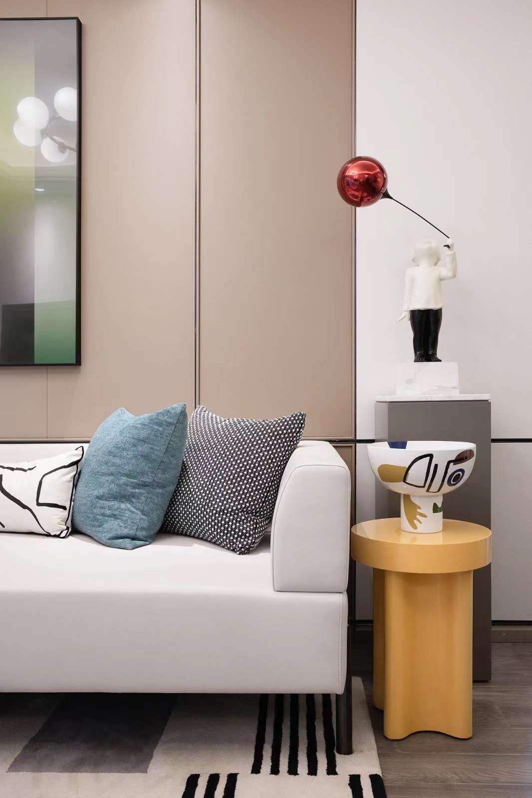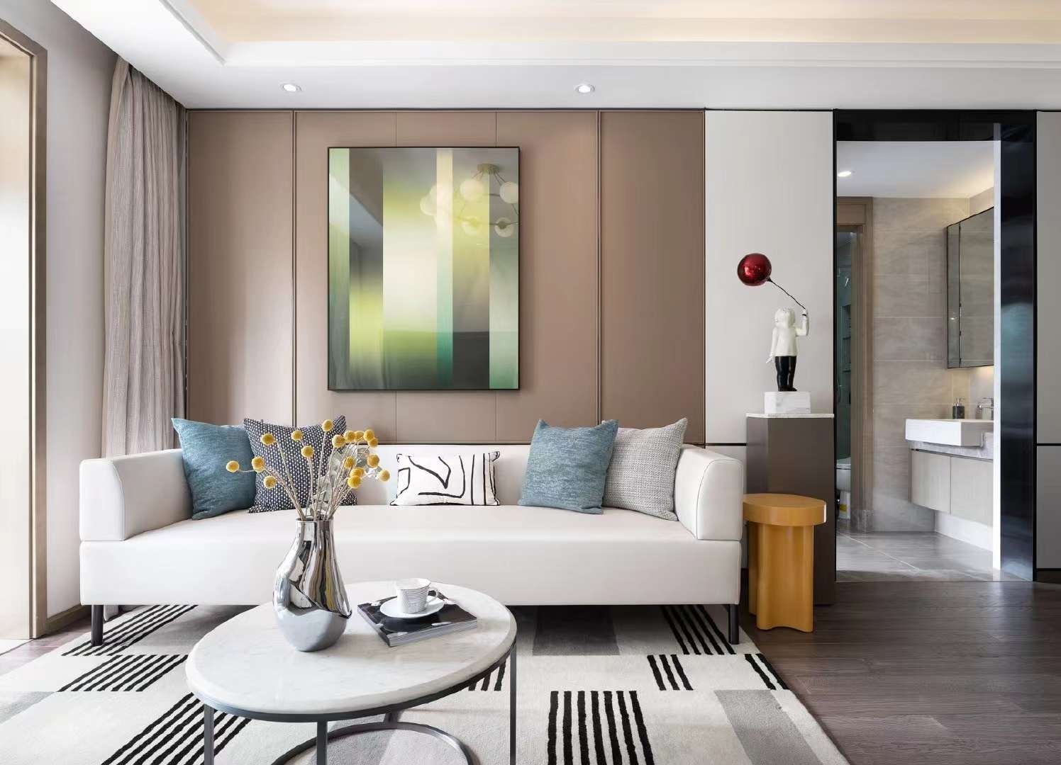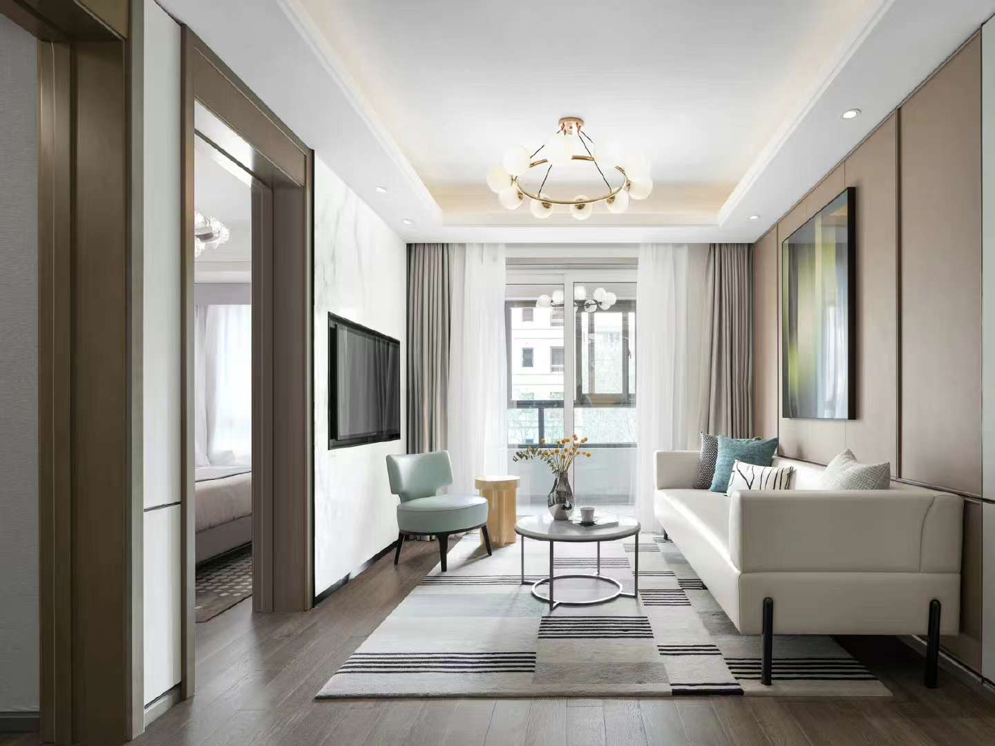 玄关、餐厅、客厅、南向阳台,由中轴贯通,极大地缩短了动线距离。每个卧室都设有大面积飘窗,延伸空间感的同时,可以在此加上自己喜欢的软装,满足老少不同的生活趣味。 客厅米白色调木饰面增加明度对比,低调的色彩营造给入住者留有很大的即兴空间!