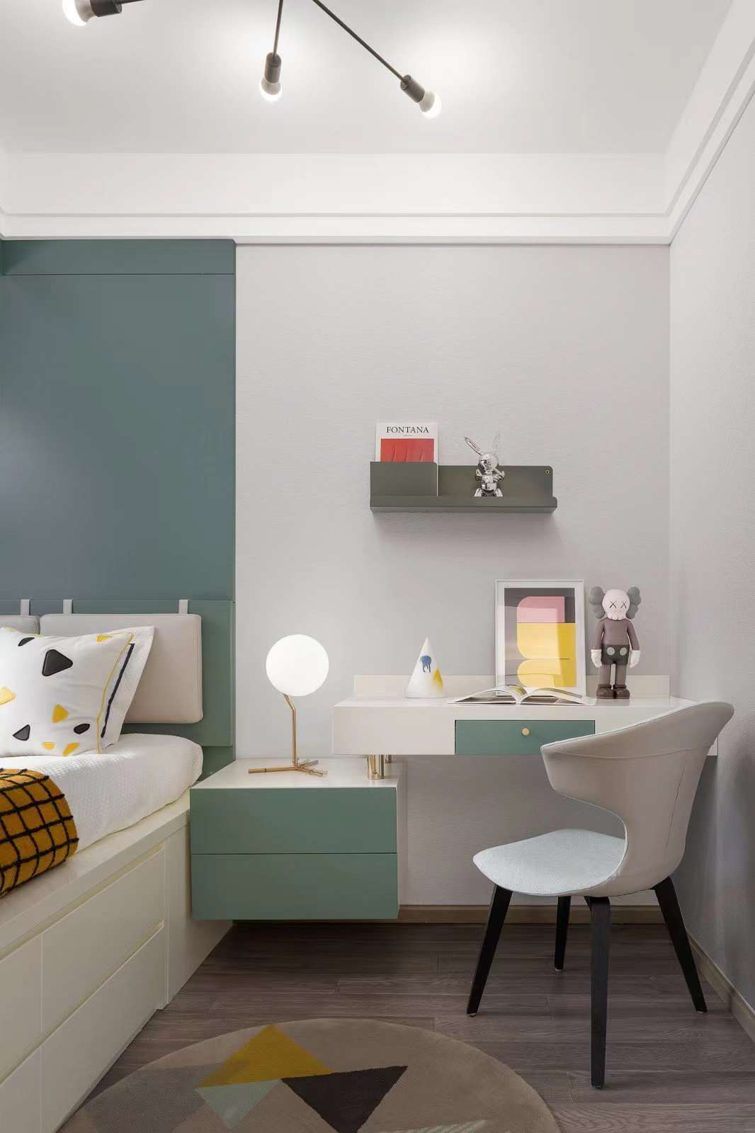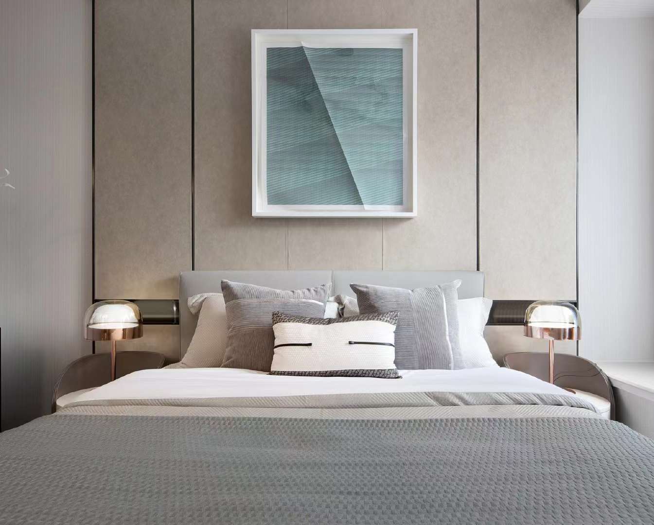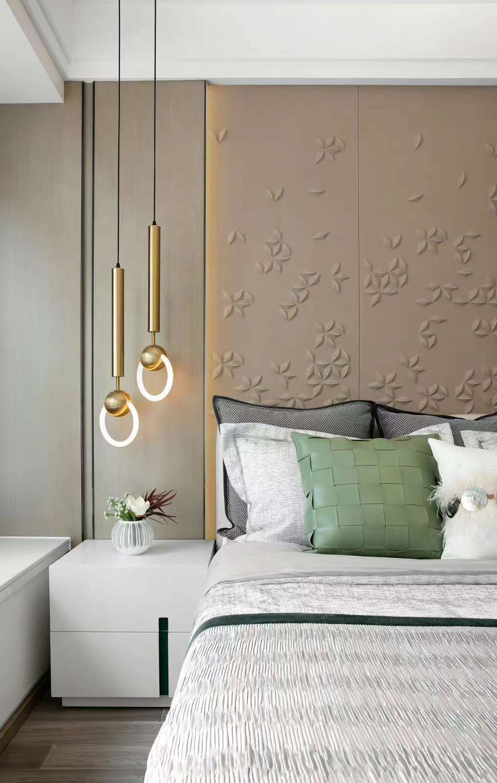 玄关、餐厅、客厅、南向阳台,由中轴贯通,极大地缩短了动线距离。每个卧室都设有大面积飘窗,延伸空间感的同时,可以在此加上自己喜欢的软装,满足老少不同的生活趣味。 客厅米白色调木饰面增加明度对比,低调的色彩营造给入住者留有很大的即兴空间!
